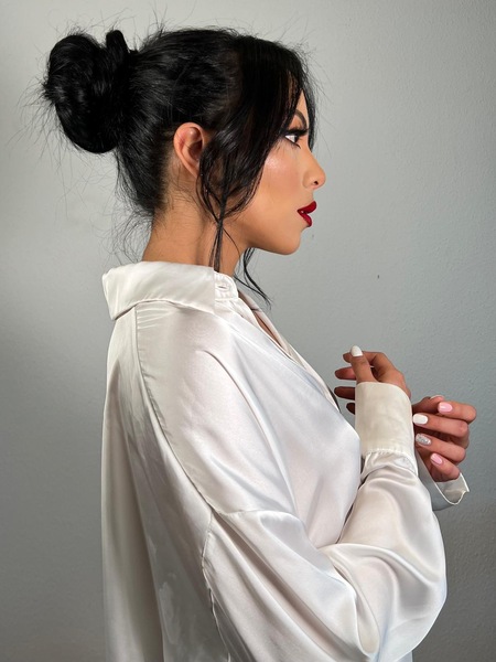 Haare:dunkelbraun, rückenlang, glatt