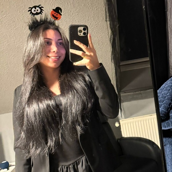 Haare:brünett, rückenlang, glatt